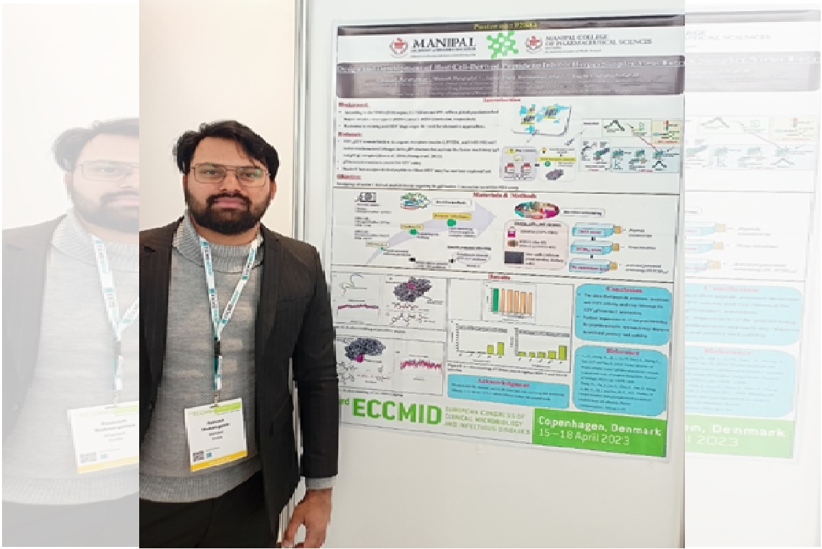 Mr. Rakesh Rahangdale, Research scholar, Department of Pharmaceutical Biotechnology at MCOPS received ESCMID FÖrderverein Grant for attending 33rd ECCMID held at Copenhagen, Denmark. The grant included free registration, accommodation, and travel tickets including visa acquisition costs. Mr. Rakesh presented his research paper entitled ‘Design and development of host cell derived peptide to inhibit Herpes simplex virus entry’ at the conference which was co-authored by Dr. Mukesh Pasupuleti (Scientist at CDRI, Lucknow), Dr. Fayaz SM (Assistant Professor, Department of Biotechnology, MIT) and Dr. Raghu Chandrashekar H. He is pursuing his research work under the guidance of Dr. Raghu Chandrashekar H, Professor, and Head, Department of Pharmaceutical Biotechnology, MCOPS, MAHE, Manipal.