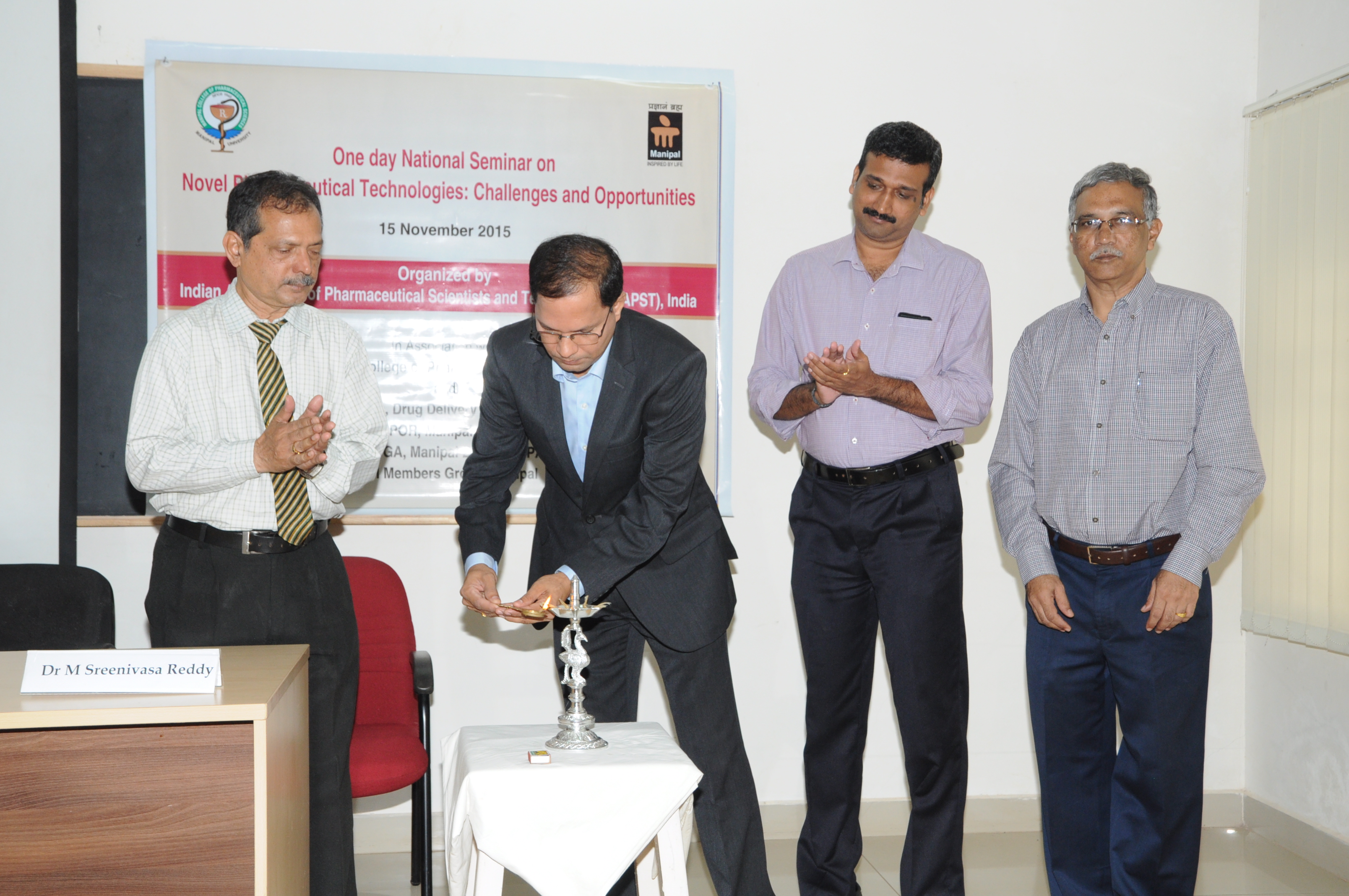 National Seminar on ‘Novel Pharmaceutical Technologies: Challenges and Opportunities’’ was organized by Indian Association of Pharmaceutical Scientists and Technologists (IAPST), India in association with Consortium of Manipal Progressive Pharmaceutical Professional Associations of Manipal College of Pharmaceutical Sciences, Manipal Academy of Higher Education on 15 November, 2015. The seminar was jointly sponsored by Stempeutics Research Pvt. Ltd., Manipal. The program was inaugurated by lighting the lamp in presence of the chief guest, Dr. Raviraja N Seetharam, Business Executive, Stempeutics and guests of honor; Dr Satish Shenoy, Director-Research (Technical), Manipal Academy of Higher Education and Dr. C. Mallikarjuna Rao, Principal, MCOPS. Dr. N. Udupa, Program Convener and Director-Research (Health Sciences), Manipal Academy of Higher Education welcomed the gathering. In his address, Dr. Raviraja highlighted the challenges faced by the biopharmaceutical industries in developing new drug delivery technologies. Dr Satish Shenoy gave a brief overview of research activities at Manipal Academy of Higher Education. The inauguration program was followed by scientific sessions which included guest lectures by Dr. Raviraja NS, Dr. K. L. Bairy, Dr. N. Udupa, Dr Srinivas Mutalik, Dr. Yogendra Nayak, Dr. C Mallikarjuna Rao and Dr. Manthan Janodia. The program was followed by poster session. During the valedictory function, certificates were distributed to the winners of the poster contest and all the participants. The vote of thanks was proposed by Dr. M. Sreenivasa Reddy, Vice-Principal, MCOPS