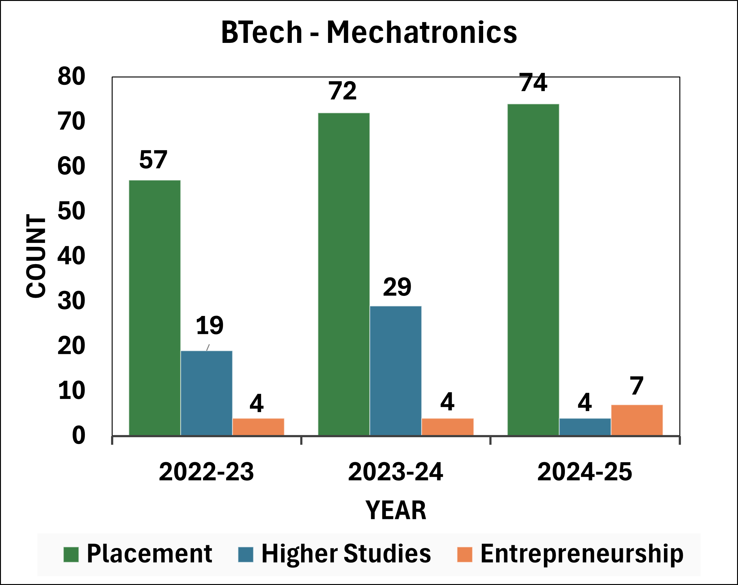 B.Tech - Mechatronics: Mechatronics is a multi-disciplinary domain lying at the intersection of Mechanical, Electrical, Electronics, and Computer Science Engineering. objective of the department is to enable students with the potential to address the future challenges by laying a strong foundation of multidisciplinary knowledge in their intellect. The school is well-equipped with laboratories set up in collaboration with industries to enable the students integrate knowledge from various engineering disciplines and get used to various industrial cases through. The school emphasizes on the industry academic partnership which benefits students to work in professional sphere during graduation, provides graduates with the research background necessary for an academic career, provides insights to nurture the entrepreneurship ambitions, opportunities for industrial experience, and experiential learning.