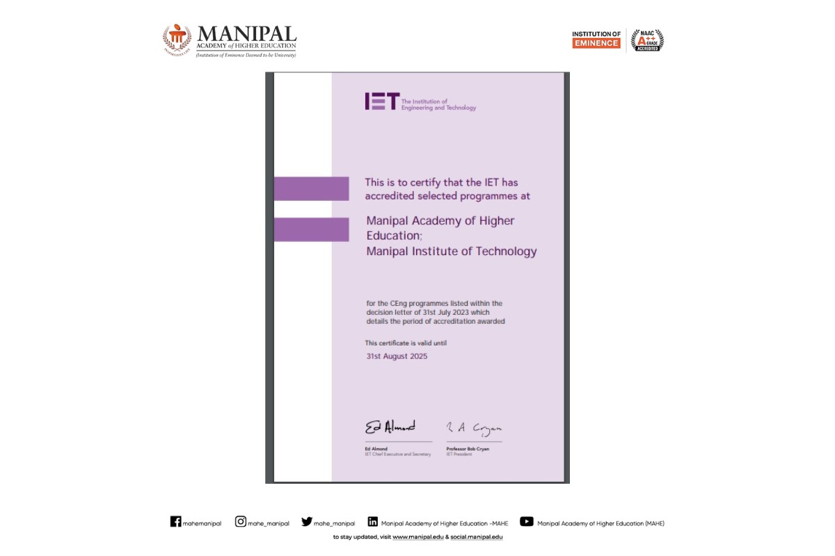 MIT, Manipal earns Institution of Engineering and Technology (IET), UK accreditation for an impressive array of 21 Undergraduate (UG) and Postgraduate (PG) programs. This opens the door for our students to register themselves as Chartered Engineers.