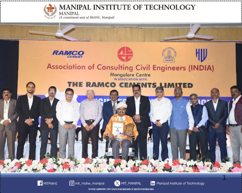 Hosted by Ramco Cement Ltd. and organized by ACCEI Mangalore Centre, the event drew over 300 guests, including top leadership from RAMCO and ACCEI. This recognition celebrates Dr. Holla’s outstanding contributions to civil engineering education and his role in inspiring future engineers across Dakshina Kannada and Udupi districts.