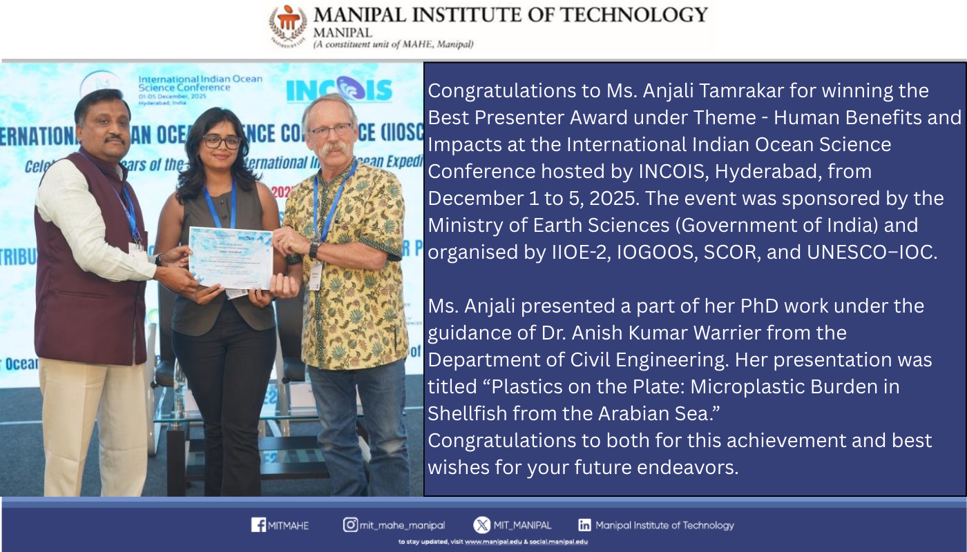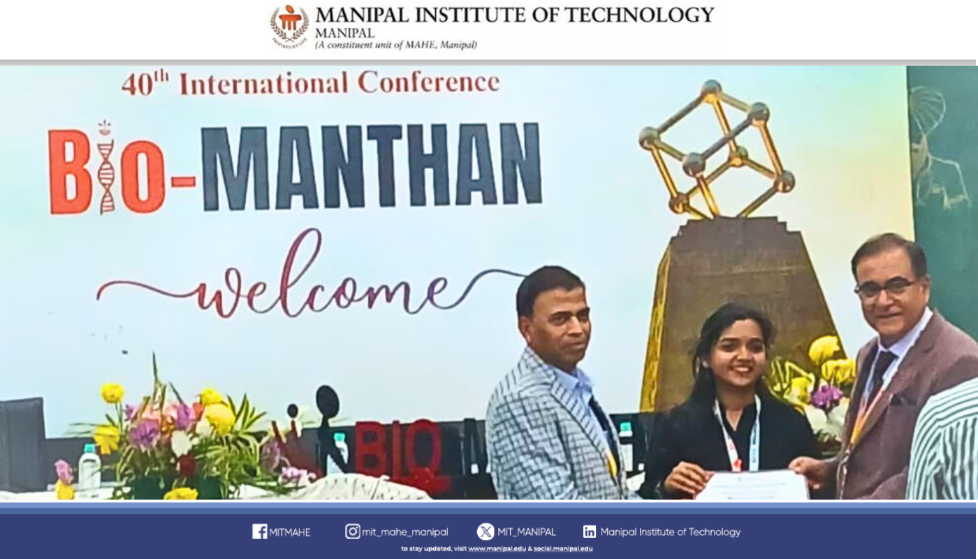 Congratulation to Ms. P. Ashwini N. Pai, Ph.D. Scholar (Dr. T. M. A. Pai Fellowship), Department of Biotechnology, MIT, has been conferred the Best Poster Award along with a cash prize at the 40th International Conference – BioMANTHAN 2025, held at IIT Ropar, Punjab (December 4–7, 2025).