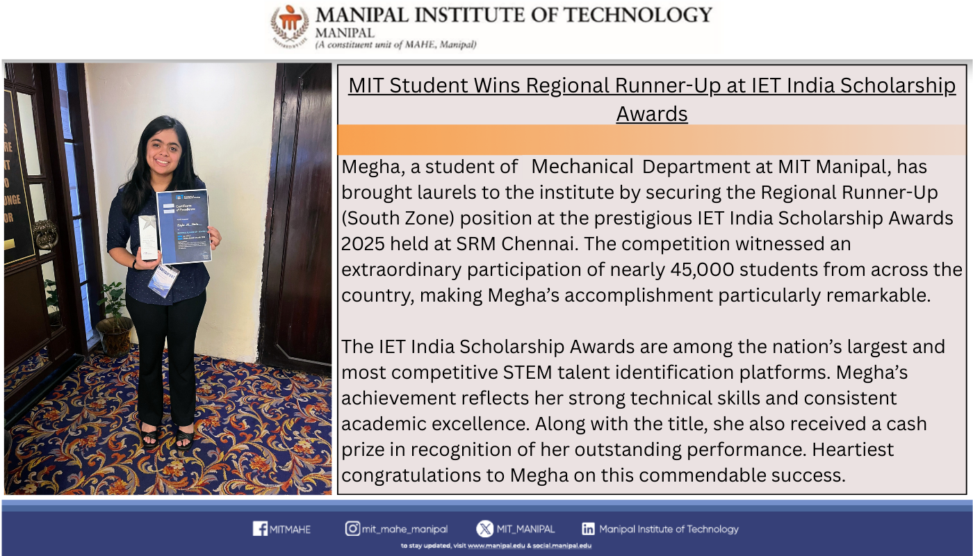 Priyanshu is among only five recipients across Manipal Academy of Higher Education (MAHE), Manipal, making this a moment of great pride for MIT. His dedication to academic excellence, innovation, and leadership continues to inspire his peers.