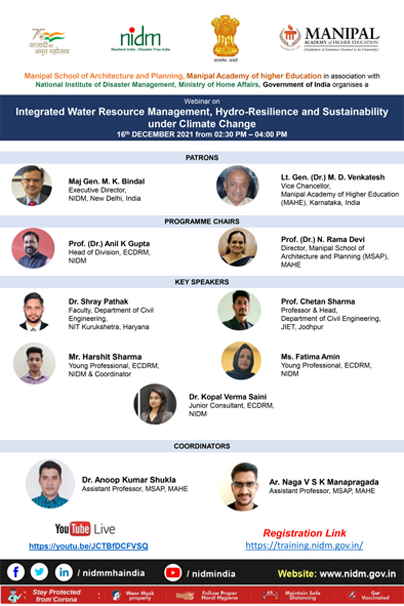 The National Institute of Disaster Management (NIDM), Ministry of Home Affairs (GoI), New Delhi & Manipal School of Architecture and Planning (MSAP), Manipal Academy of Higher Education (MAHE), Karnataka is conducting the webinar on “Integrated Water Resource Management, Hydro-Resilience and Sustainability under Climate Change” on 16th December 2021 from 2:30 pm to 4:00 pm.