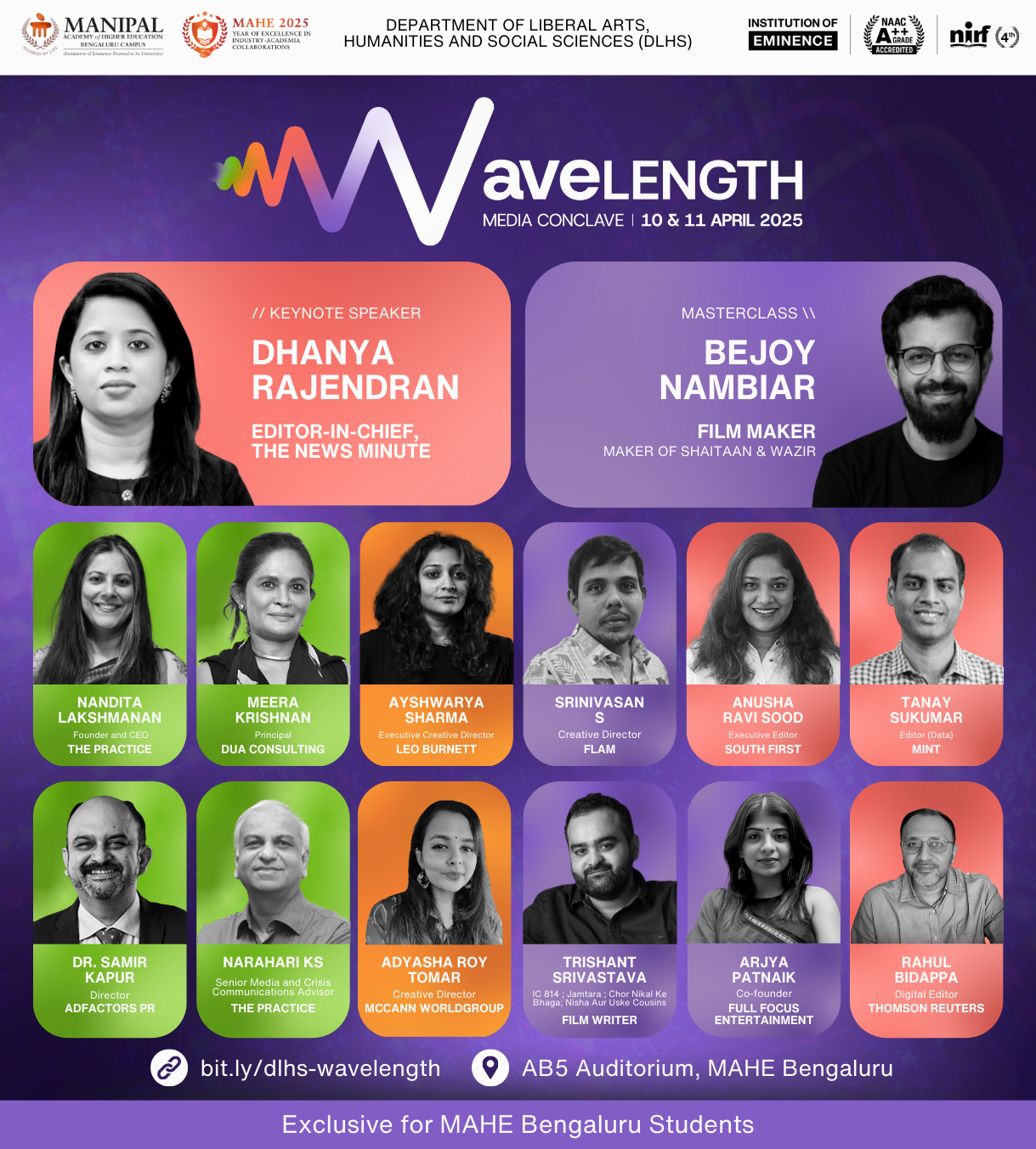 Wavelength, hosted by the Department of Liberal Arts, Humanities, and Social Sciences (DLHS) at MAHE Bengaluru, is a premier media conclave bringing together industry leaders, academic experts, and aspiring media professionals for insightful discussions on the ever-changing world of communication. We bring you a line-up of marquee speakers like Dhanya Rajendran, Editor-in-Chief, The News Minute; Bejoy Nambiar, Film Maker of Shaitaan (2011) and Wazir (2016); and Trishant Srivastava, Film Writer of  Jamtara: Sabka Number Ayega (2020) and Chor Nikal Ke Bhaga (2023).