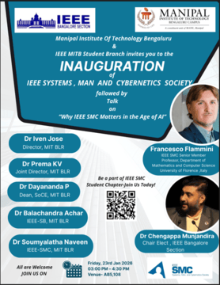 On behalf of the IEEE Student Branch and the School of Computer Engineering, Manipal Institute of Technology, Bengaluru, we are delighted to invite you to the Inauguration of the IEEE Systems, Man, and Cybernetics (SMC) Society at MIT Bengaluru.