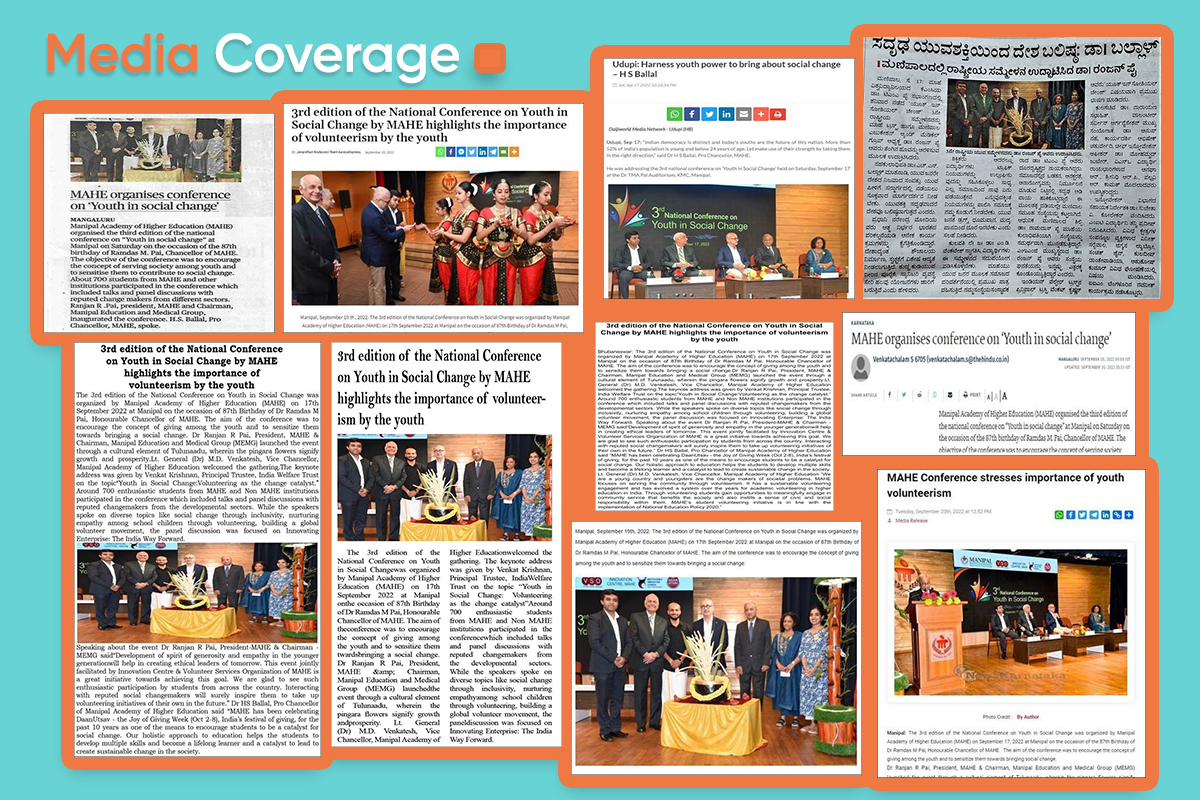 Manipal, September 19th, 2022: The 3rd edition of the National Conference on Youth in Social Change was organized by Manipal Academy of Higher Education (MAHE) on 17th September 2022 at Manipal on the occasion of the 87th Birthday of Dr Ramdas M Pai, Honourable Chancellor of MAHE. The conference aimed to encourage the concept of giving among the youth and to sensitize them towards bringing social change.