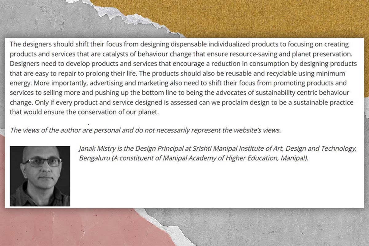 Manipal 06th June 2022: The author’s article, “The importance of Design for a Sustainable Future” by Janak Mistry, Design Principal, Srishti Manipal Institute of Art, Design and Technology, (SMI), MAHE-Bengaluru.