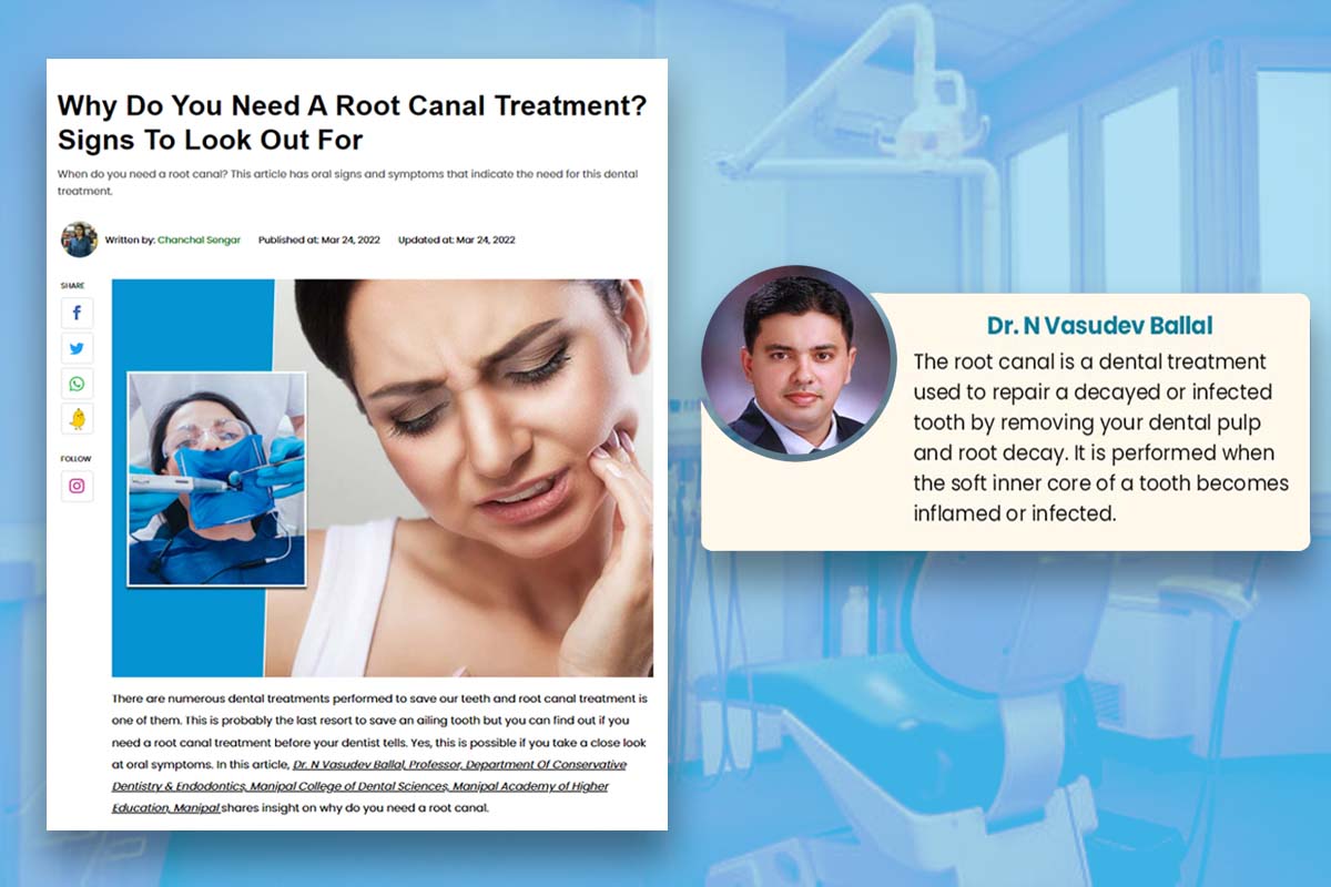 Manipal, 25th March 2022: The author’s article, “Why Do You Need A Root Canal Treatment? Signs To Look Out For” by Dr. N Vasudev Ballal, Professor, Department of Conservative Dentistry & Endodontics, MCODS, MAHE Manipal.