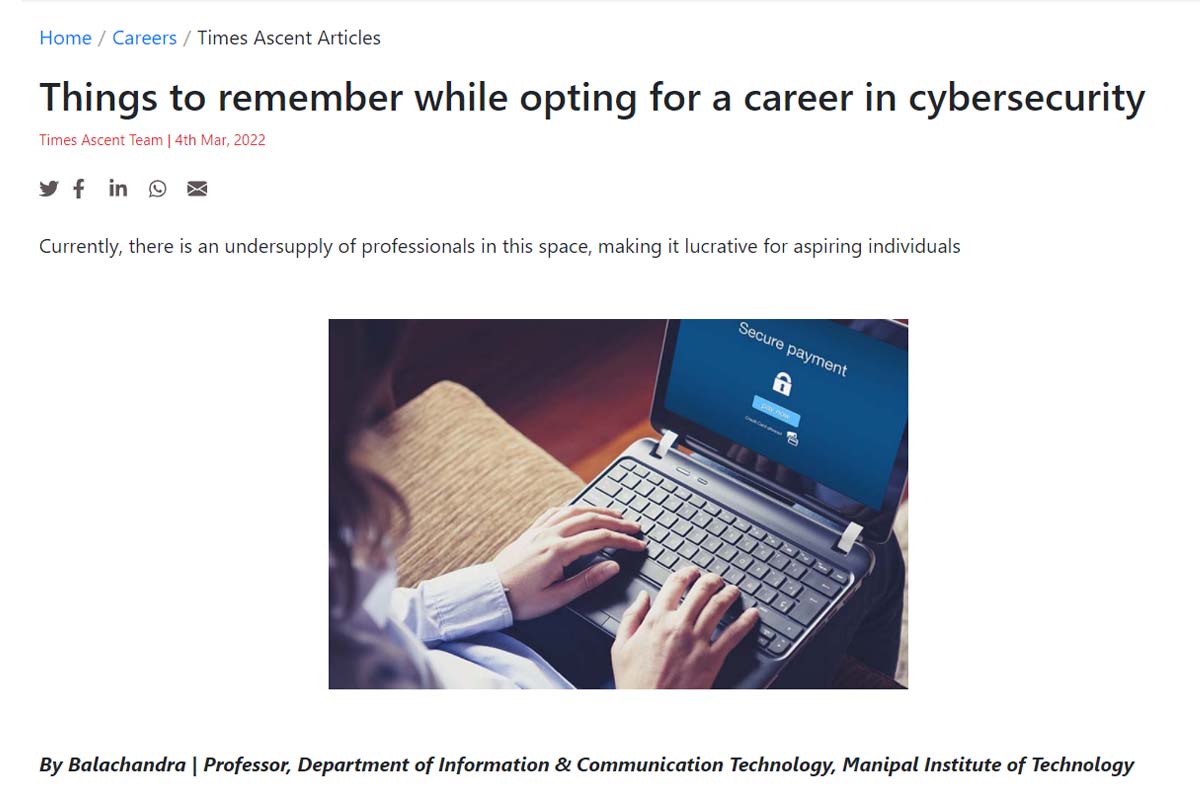 Manipal, 05th March 2022: The author’s article “Things to remember while opting for a career in cybersecurity” by Dr Balachandra, Professor, Department of Information & Communication Technology, Manipal Institute of Technology, MAHE Manipal.