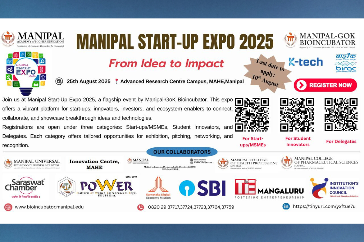 Manipal, August 8, 2025: Bioincubator of Manipal Academy of Higher Education (MAHE), an Institution of Eminence Deemed-to-be University, is set to host the prestigious Manipal Start-Up Expo 2025 on August 25, 2025, at the Advanced Research Centre Campus, Manipal. M-GOKB, a Technology Business Incubator established by MAHE and supported by Karnataka Innovation and Technology Society (KITS), Government of Karnataka, and Biotechnology Industry Research Assistance Council (BIRAC), Department of Biotechnology, Government of India, serves as the driving force behind this initiative, dedicated to fostering and scaling start-ups by providing a nurturing ecosystem for technology-based innovation and supporting the entrepreneurial journey from ideation to product commercialization. This flagship event promises to be a dynamic showcase of India's most innovative minds and breakthrough technologies.