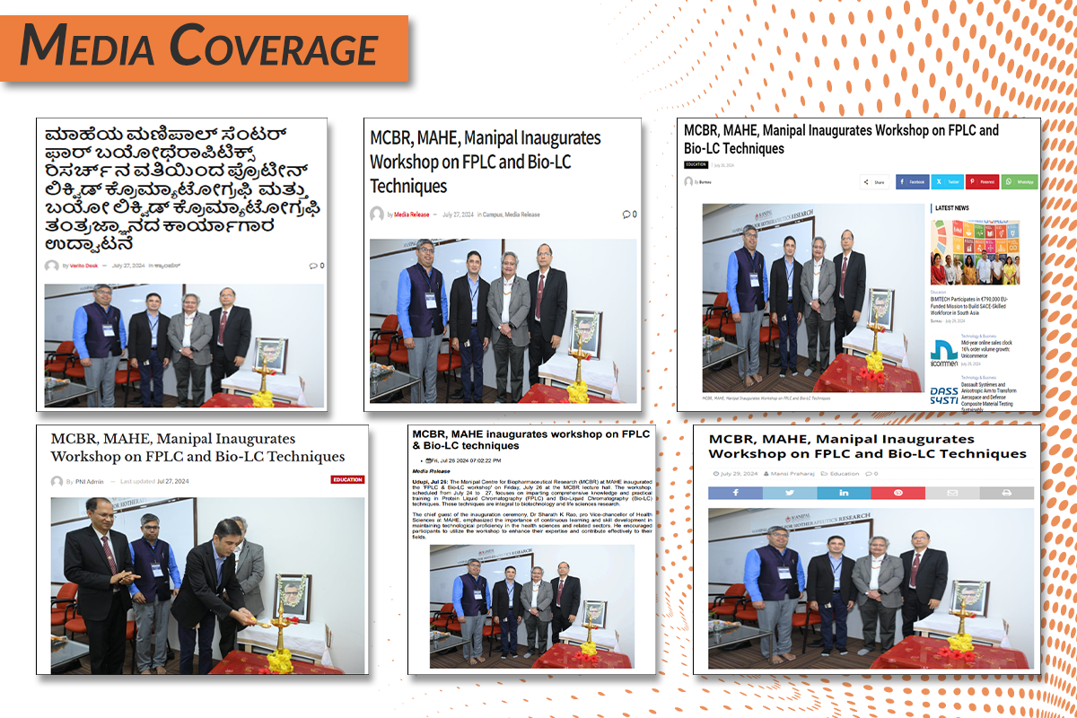 Manipal, July 26, 2024: The Manipal Centre for Biopharmaceutical Research (MCBR) at MAHE inaugurated the 'FPLC & Bio-LC Workshop' today at the MCBR Lecture Hall. The workshop, scheduled from July 24 to July 27, 2024, focuses on imparting comprehensive knowledge and practical training in Protein Liquid Chromatography (FPLC) and Bio-Liquid Chromatography (Bio-LC) techniques. These techniques are integral to biotechnology and life sciences research.