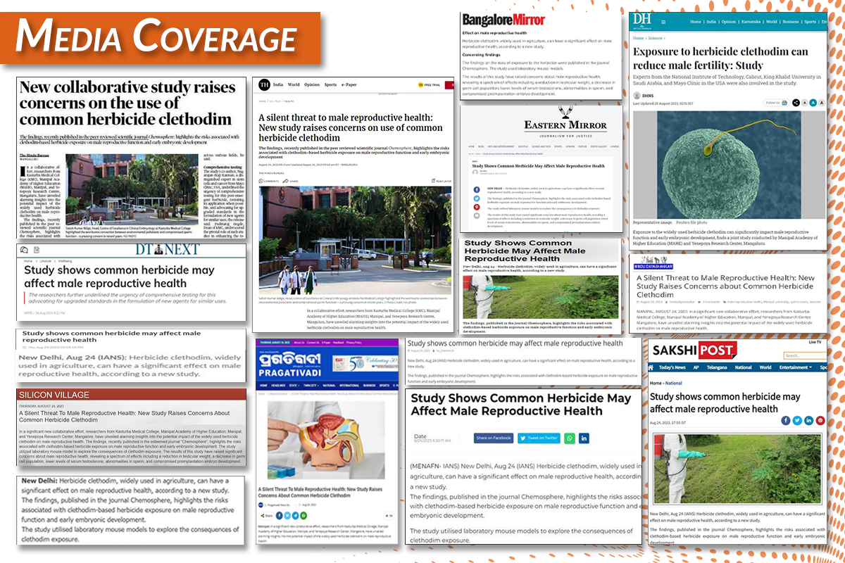 Manipal; 24 August 2023: In a significant new collaborative effort, researchers from Kasturba Medical College, Manipal Academy of Higher Education, Manipal, and Yenepoya Research Center, Mangalore, have unveiled alarming insights into the potential impact of the widely used herbicide clethodim on male reproductive health. The findings, recently published in the esteemed journal "Chemosphere", highlight the risks associated with clethodim-based herbicide exposure on male reproductive function and early embryonic development. The study utilised a laboratory mouse model to explore the consequences of clethodim exposure. The results of this study have raised significant concerns about male reproductive health, revealing a spectrum of effects, including a reduction in testicular weight, a decrease in germ cell population, lower levels of serum testosterone, abnormalities in sperm, and compromised preimplantation embryo development.