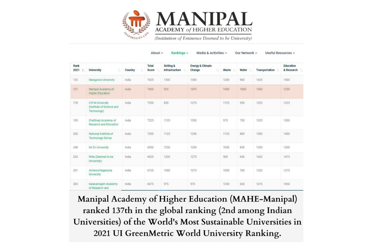 The Manipal Academy of Higher Education (MAHE-Manipal) entered the league, MAHE ranked 137 in the global ranking and 2nd among Indian universities in the annual UI GreenMetric World University.