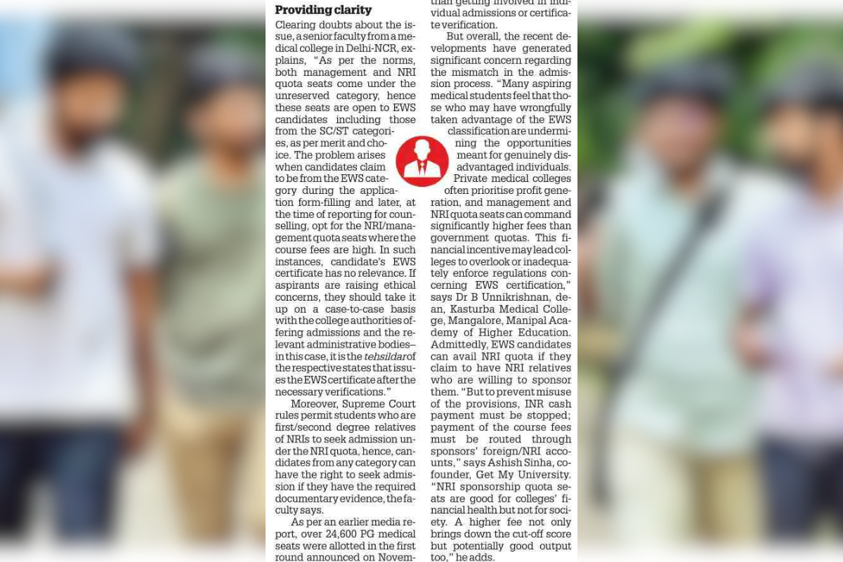 Manipal, 20 December 2024: “Will EWS students securing NRI and management quota seats create a level playing field” valuable insights are given by Dr B. Unnikrishnan, Dean & Professor of Community Medicine, Kasturba Medical College (KMC), Mangalore.