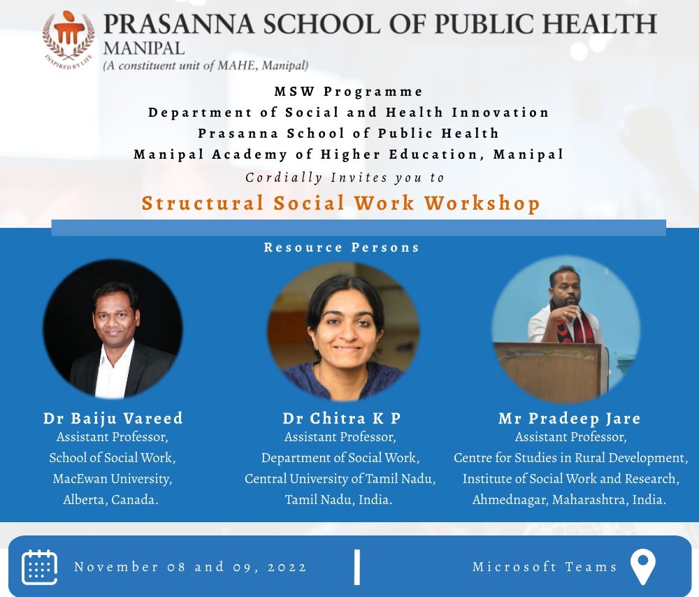 MSW Programme, Department of Social and Health Innovation, Prasanna School of Public Health, Manipal Academy of Higher Education, Manipal organized a "Structural Social Work Workshop" on November 08 and 09, 2022.
