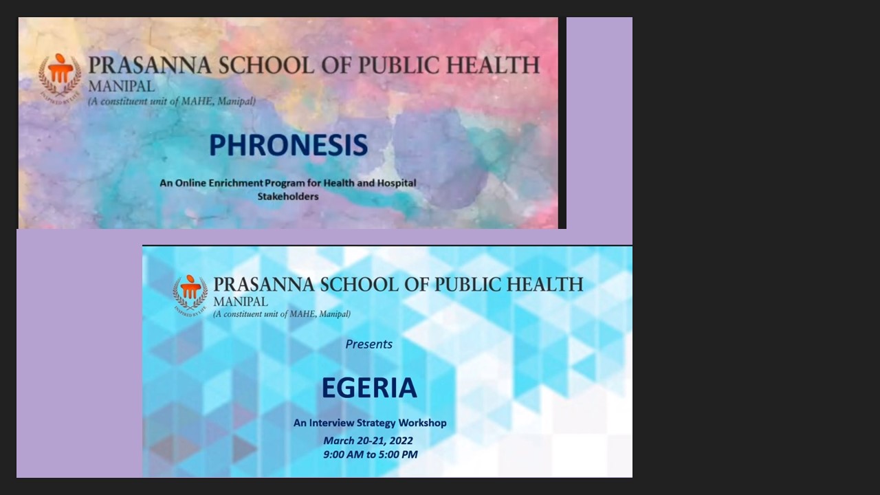 Career counselling cell, Prasanna School of Public Health had organized PHRONESIS & EGERIA– an online interactive learning workshop on diverse range of topics by industry professionals for the students. CV writing and one-on-one mock interview were also conducted.