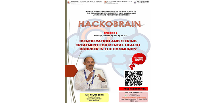 MSW Program, Prasanna School of Public Health, The Department of Psychiatry, KMC, Manipal and Life Forward Foundation is Organizing a Webinar: Hackobrain - Episode 2 - Identification and Seeking Treatment for Mental Health Disorder in the Community  on September 12, 2020.