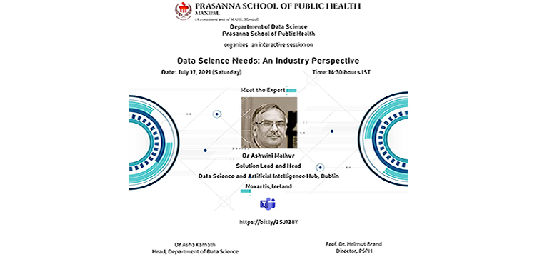 Department of Data Science, Prasanna School of Public Health is organizing an interactive career enhancement session "Data Science Needs: An Industry Perspective" on July 17, 2021 (14:30 hours IST) through Microsoft Teams.