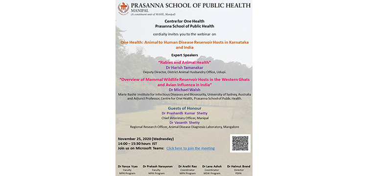 Centre for One Health, Prasanna School of Public Health is organizing a webinar on "One Health: Animal to Human Disease Reservoir Hosts in Karnataka and India" through Microsoft Teams on November 25, 2020 (Wednesday), 14:00 - 15:30 hours IST.