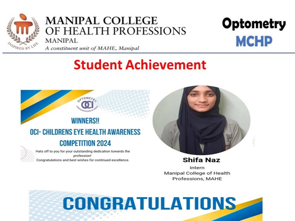 Ms. Shifa Naaz Intern (Bachelor of Optometry) from Department of Optometry, Manipal College of Health Professions (MCHP), Manipal has participated in the Children's Eye Health Awareness and Safety month contest hosted by the Optometry Confederation of India (OCI) in month of August 2024.