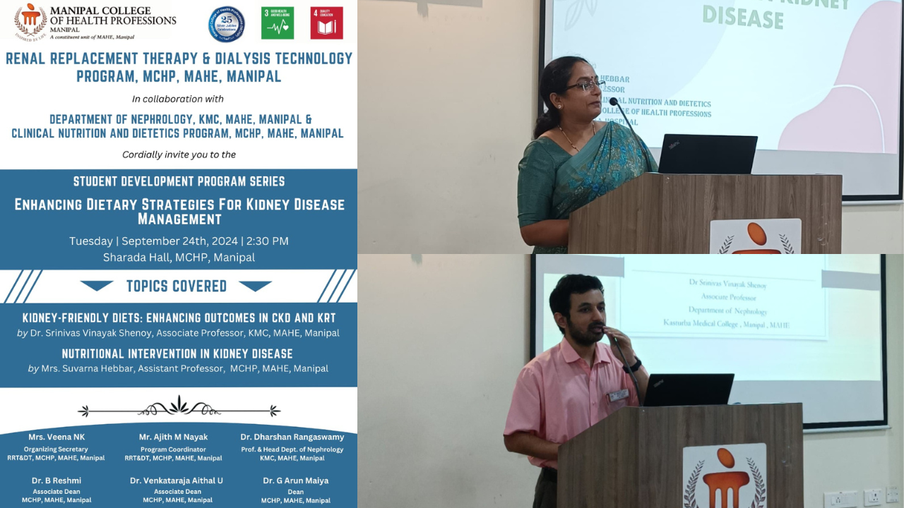 The Renal Replacement Therapy and Dialysis Technology program at MCHP, MAHE, Manipal, in collaboration with the Department of Nephrology, KMC, MAHE, Manipal, and the Clinical Nutrition and Dietetics program at MCHP, MAHE, Manipal, conducted a student development program series on “Enhancing Dietary Strategies For Kidney Disease Management”. The workshop was held on September 24, 2024, at Sharada Hall, MCHP, MAHE, Manipal. The event aimed to provide valuable insights to RRT and DT students regarding the nutritional aspects of managing patients with kidney disease.