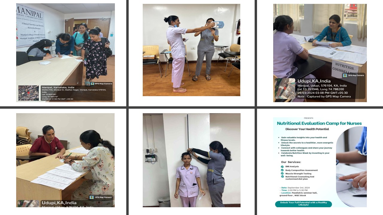 As part of National Nutrition Week 2024, Clinical Nutrition and Dietetics Program, Manipal college of Health Professions and Department of Clinical Nutrition and Dietetics, Kasturba Hospital, MAHE, Manipal organinzed a Nutritional evaluation camp for nurses on 3rd September, 2024. Participants were registered at the start of the camp, where their height and weight were measured. A complete body composition analysis and hand grip strength assessment were also conducted. Interns assisted in measuring height, weight, body composition, and hand grip strength. Following the assessments, participants were directed to nutrition counseling, where dietitians provided personalized dietary advice based on the results.