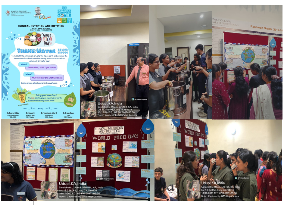 The Clinical Nutrition and Dietetics program, Manipal College of Health Professionals, MAHE, Manipal, celebrated World Food Day on 17th October 2023 (Tuesday) from 12:00pm – 13:30 pm. This was held to highlight the critical role of water for life on Earth and water as the foundation of our food. Various nutritious and delicious drinks were served to the students and faculty of Manipal College of Health Professionals, MAHE, for free of cost.