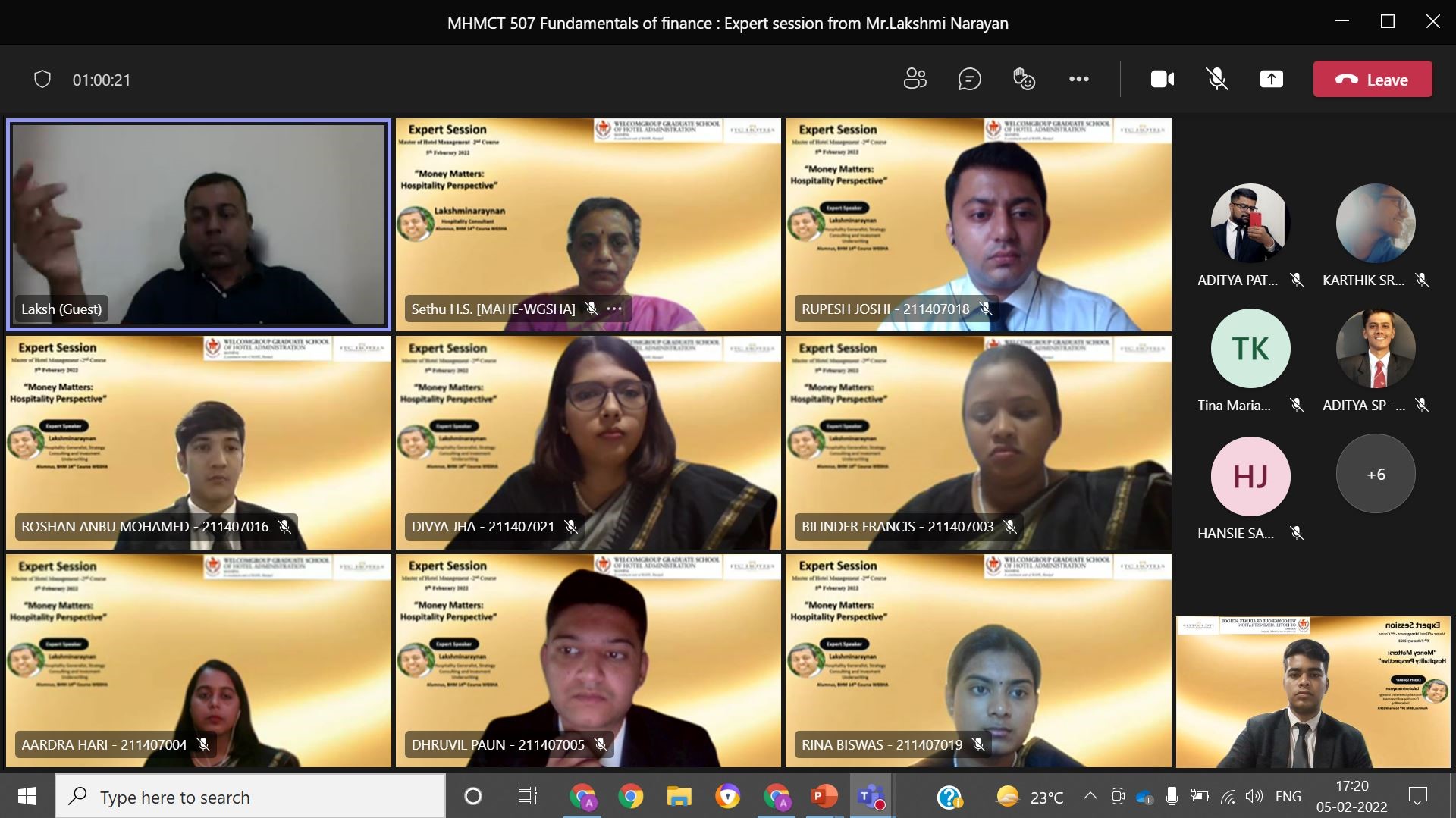 WGSHA Manipal FEB 05, 2022: The expert session on “Money Matters: Hospitality Perspective” was arranged for the students of WGSHA to learn about the rising usefulness and importance of finance in the hospitality Industry.