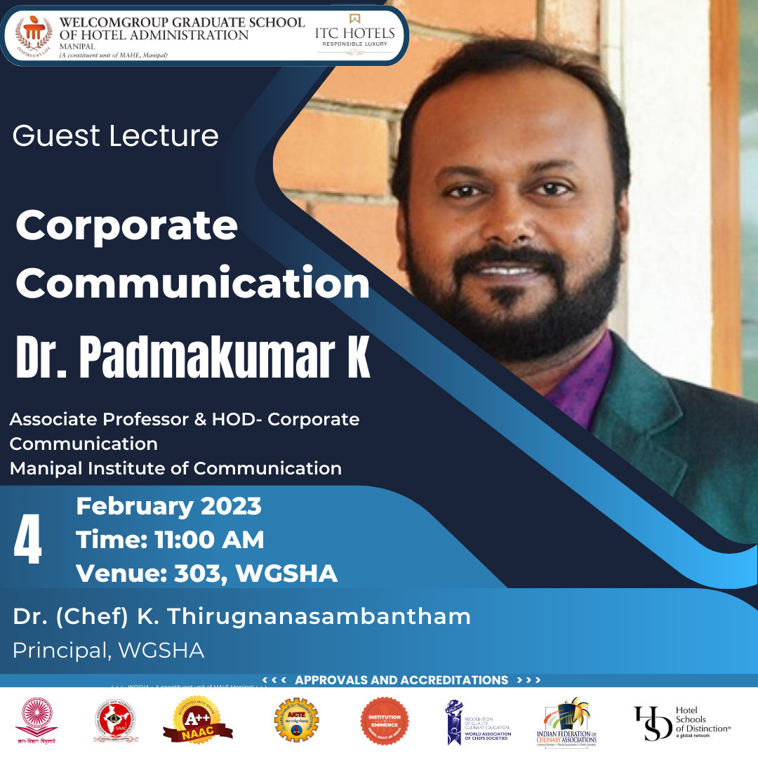 n the 4th of February 2023, a guest lecture by a distinguished faculty from the Manipal Institute of Communication, MAHE is being organized for 3rd-course students of the MHM&CT program. Dr. Padmakumar K, Ph.D. is an Associate Professor & HOD -Corporate Communication at Manipal Institute of Communication, MAHE, Manipal. Sir will be engaging students in a session on Corporate Communication. Students will surely inculcate numerous learnings from his rich and diversified experience of effective communication styles.