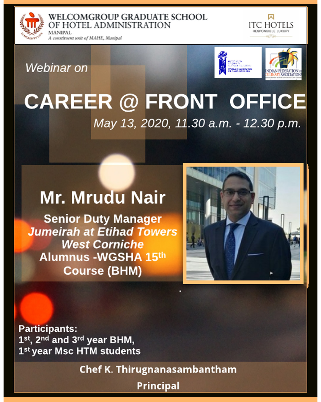 On the 13th of May, 2020, the students of WGSHA were privileged to attend a webinar on the Microsoft Teams app, by Mr. Mrudu Nair - as a Senior Duty Manager at the Jumeirah at Etihad Towers, West Corniche. Sir is an alumnus of WGSHA, part of the 15th Course BHM. Mr. Nair started off the lecture by reminiscing about his college days in Manipal, and how great of a campus it was. Mr. Nair spoke about the diversity he experienced in Manipal and the kind of exposure the college provided. Originally aspiring to become a chef, sir spoke about his journey from the Kitchen to Front Office, after gaining some exposure to the industry.