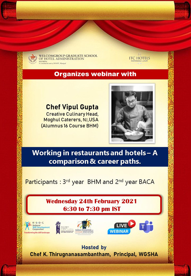 • Virtual cooking demo and lecture on "Food Tourism in India" by Dr. Chef Thiru for School of Hospitality Business Management